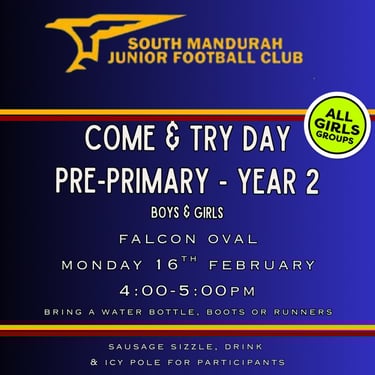 Our Auskick (PP, Year 1) and Superkick (Year 2) Come & Try Day for 2026 Saturday 16th of February 4-5pm Falcon Oval. More Information.