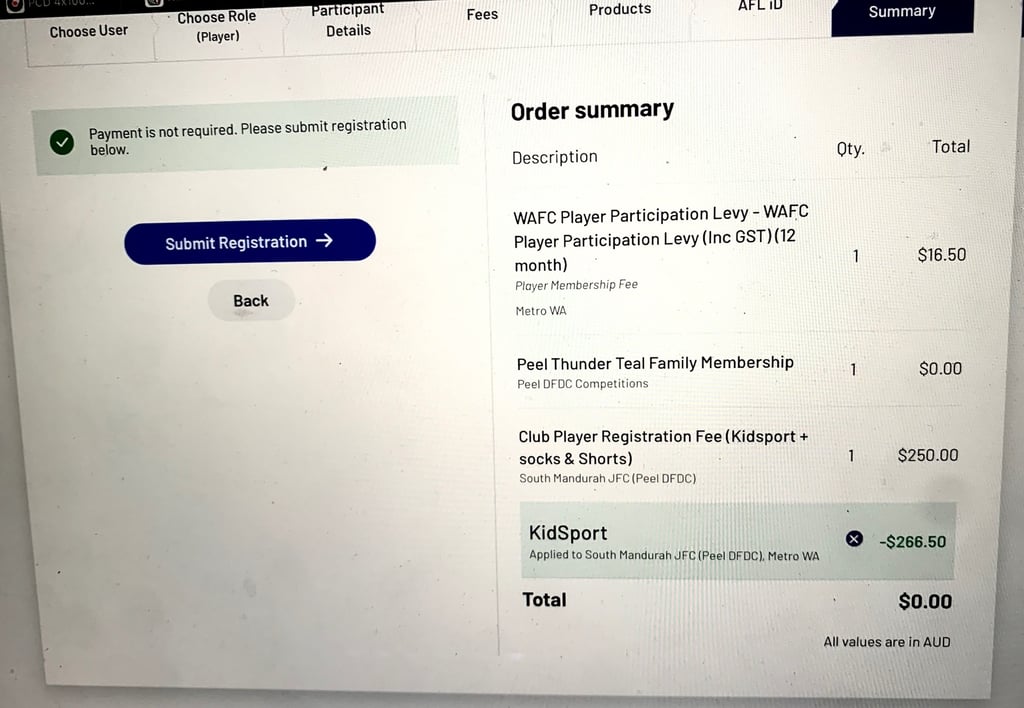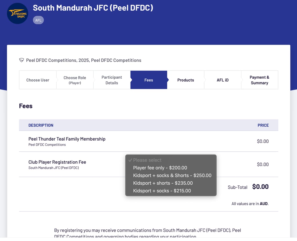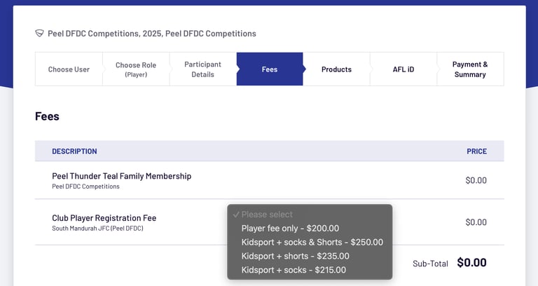 3 - FEES page select the option that matches what was selected in your Kidsport Voucher Application (Player Fee only, Kidsport + socks & Shorts, Kidsport + shorts, Kidsport + socks).