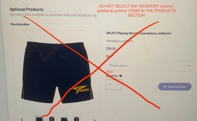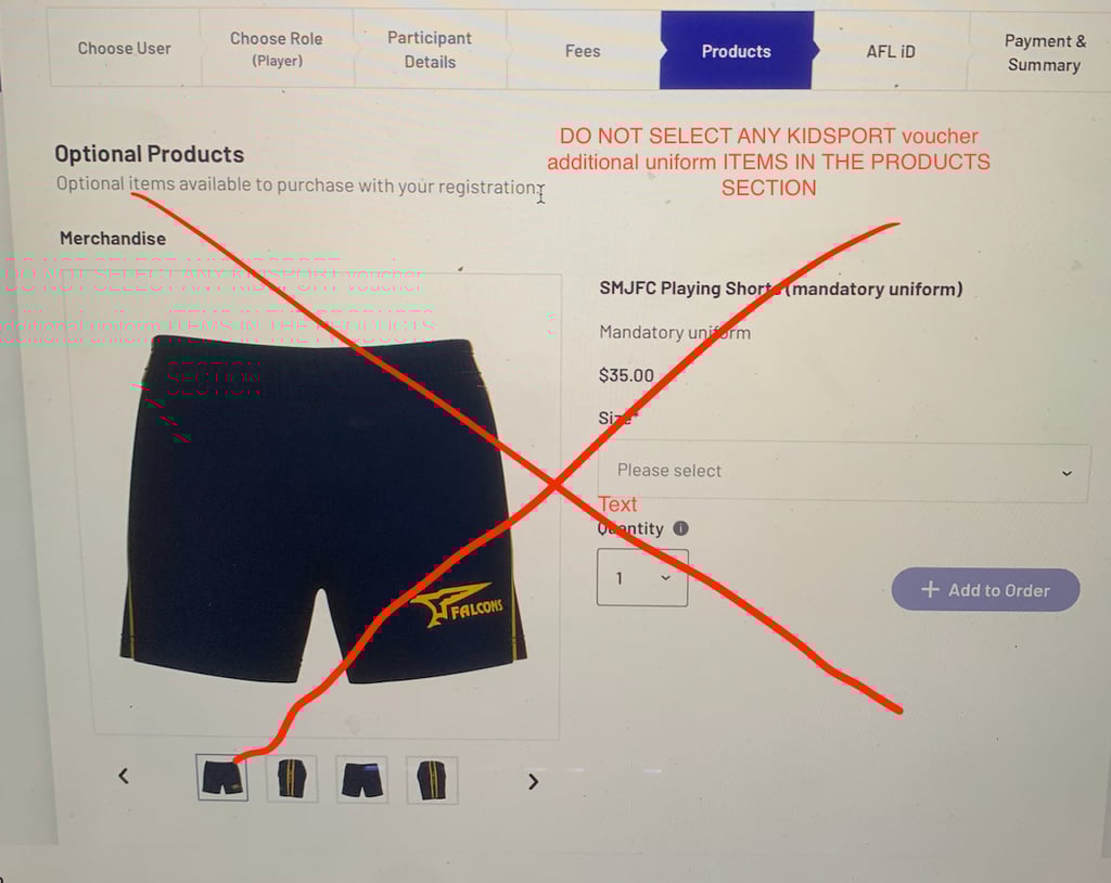 4 - PRODUCTS - DO NOT select KIDSPORT shorts or socks in the PRODUCT section. You should have selected them at the FEE section. Scroll to the bottom and click continue.(Simply Email your SIZE and STYLE to merchandise@smjfc.com.au after registration).